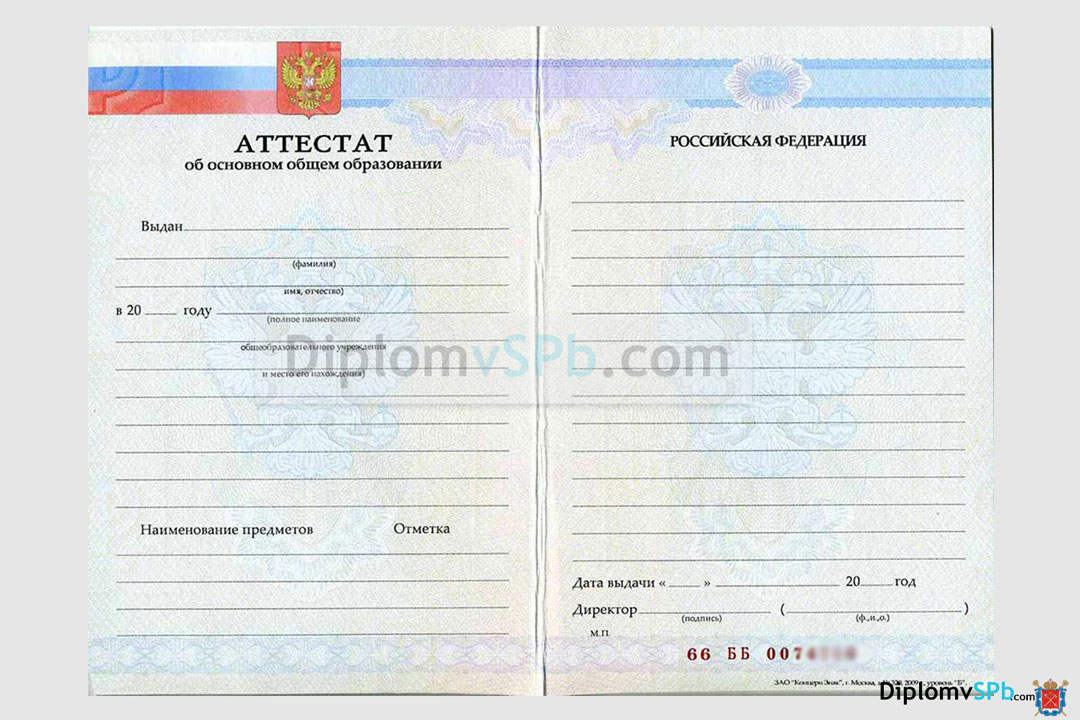 Данные, необходимые для заказа аттестата за 9 класс: ФИО выпускника, дата и место рождения, год окончания учебы, город и школа, оценки по предметам (по желанию), ФИО директора (если знаете). Наши аттестаты заполняются по стандартам Минобрнауки РФ. Можем сделать точную копию по Вашему образцу